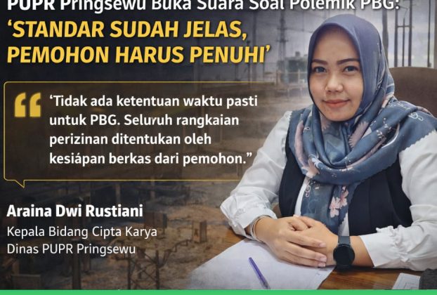 Pringsewu – Setelah menuai sorotan terkait lambannya proses penerbitan Persetujuan Bangunan Gedung (PBG), Dinas Pekerjaan Umum dan Perumahan Rakyat (PUPR) Kabupaten Pringsewu akhirnya angkat bicara. Kepala Bidang Cipta Karya, Araina Dwi Rustiani, menegaskan bahwa tidak ada unsur mempersulit dalam proses perizinan. Menurutnya, seluruh penilaian teknis telah mengacu pada regulasi yang berlaku, khususnya Peraturan Pemerintah (PP) […]