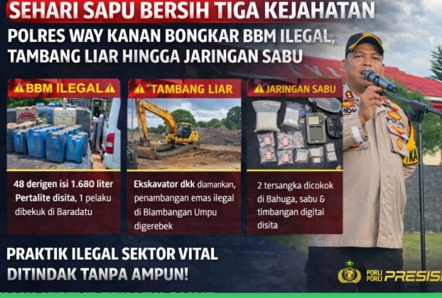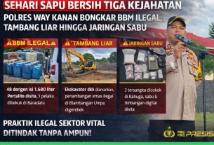 WAY KANAN – Dalam satu hari, aparat kepolisian di Kabupaten Way Kanan menunjukkan taringnya. Tiga tindak pidana strategis sekaligus, penyalahgunaan BBM subsidi, pertambangan ilegal, dan peredaran narkotika dibongkar dalam operasi yang berlangsung nyaris tanpa jeda, Minggu (12/4/2026). Pengungkapan ini tak sekadar penindakan biasa, melainkan sinyal kuat bahwa praktik-praktik ilegal yang selama ini diduga berjalan rapi […]