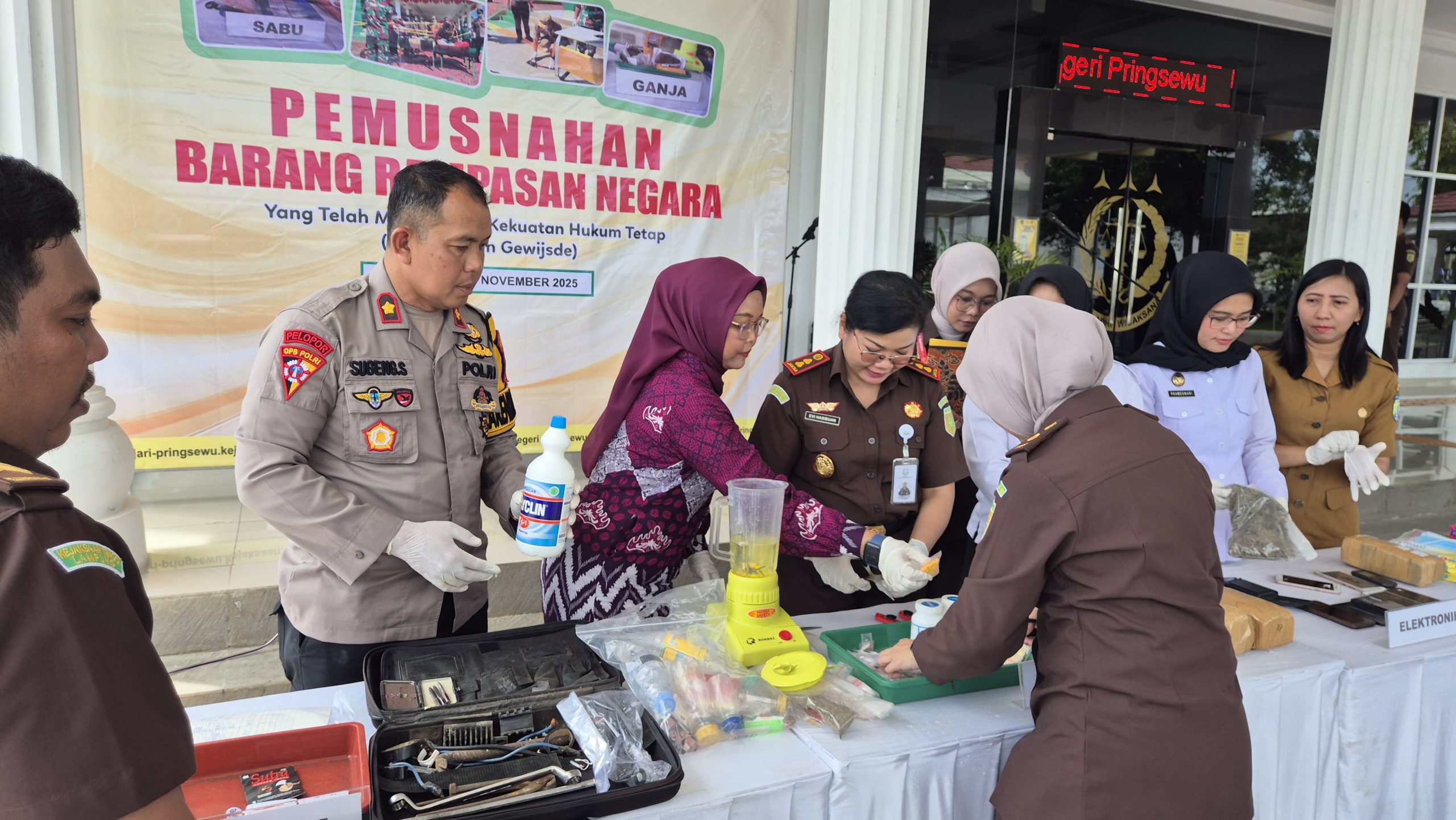 Barang-barang tersebut dimusnahkan menggunakan metode pembakaran, pemotongan, hingga penghancuran, dilakukan langsung oleh Kepala Kejari Pringsewu bersama para tamu undangan.