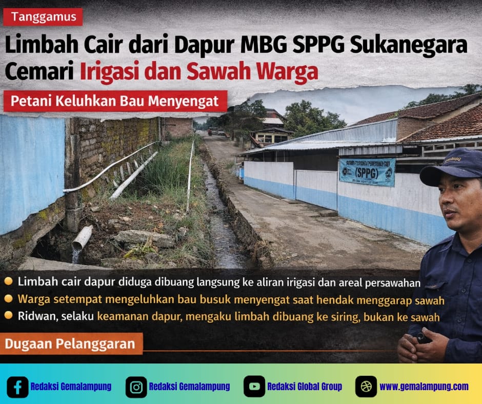 TANGGAMUS – Aktivitas dapur program Makan Bergizi Gratis (MBG) di Satuan Pelayanan Pemenuhan Gizi (SPPG) Sukanegara, Kecamatan Bulok, Kabupaten Tanggamus, menuai sorotan. Limbah cair dari dapur tersebut diduga dibuang langsung ke aliran irigasi dan areal persawahan warga tanpa pengolahan memadai. Akibatnya, petani mengeluhkan bau menyengat yang muncul saat mereka hendak mengolah lahan. Kondisi ini bukan […]