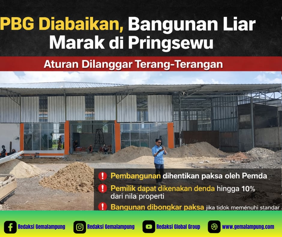 Salah satu contoh nyata terlihat di Kelurahan Pringsewu Utara. Sebuah gudang material bangunan (keramik) dibangun tanpa PBG dan tetap berjalan tanpa hambatan berarti.