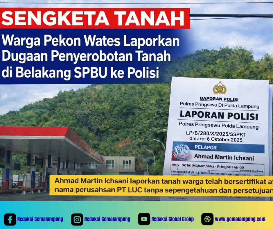 Ahmad Marti Ichsani, warga Pekon Wates, kepada media ini mengaku telah melaporkan dugaan penyerobotan tanah yang diduga menimpa dirinya serta sejumlah warga setempat. Laporan tersebut teregistrasi dalam Laporan Polisi Nomor: LP/B/280/X/2025/SPKT/Polres Pringsewu/Polda Lampung, tertanggal 6 Oktober 2025, dengan Ahmad Marti Ichsani sebagai pelapor sekaligus korban.
