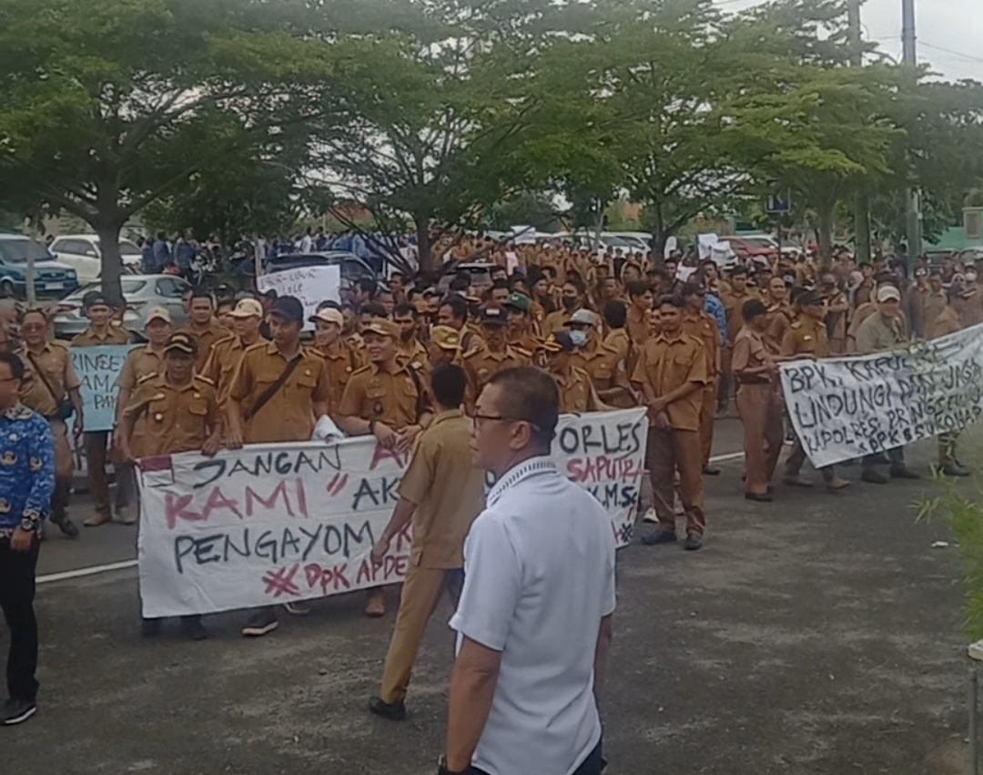 Pringsewu | Aksi bela Kapolres Pringsewu AKBP M. Yunnus, ratusan massa gabungan dari kalangan aparatur pekon, para guru dan kepala sekolah serta perwakilan beberapa OPD gelar aksi damai di depan halaman kantor bupati setempat, Senin (17/3).