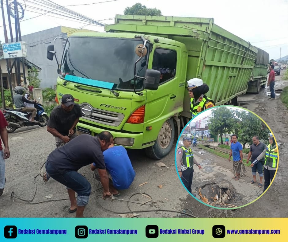“Truk fuso terperosok karena gorong-gorong di bawah badan jalan amblas. Kendaraan tidak bisa keluar dari lubang dan menyebabkan arus lalu lintas tersendat,” ujar Iptu Kadek mewakili Kapolres Pringsewu AKBP M. Yunnus Saputra.