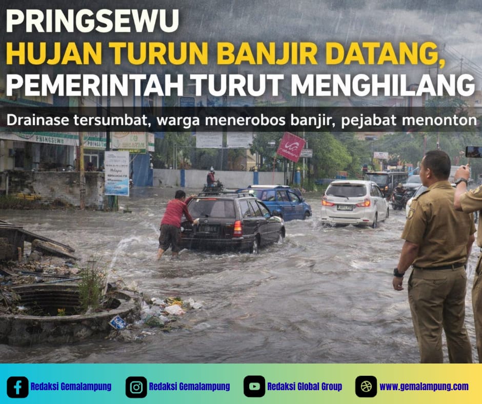 PRINGSEWU – Kabupaten Pringsewu, banjir bukan lagi bencana alam. Ia telah menjelma menjadi konsekuensi logis dari kelalaian struktural yang dipelihara dari tahun ke tahun. Setiap curah hujan meninggi, air meluap, jalan tergenang, aktivitas lumpuh. Polanya nyaris saklek dan ironisnya, pemerintah selalu berpura-pura terkejut.
