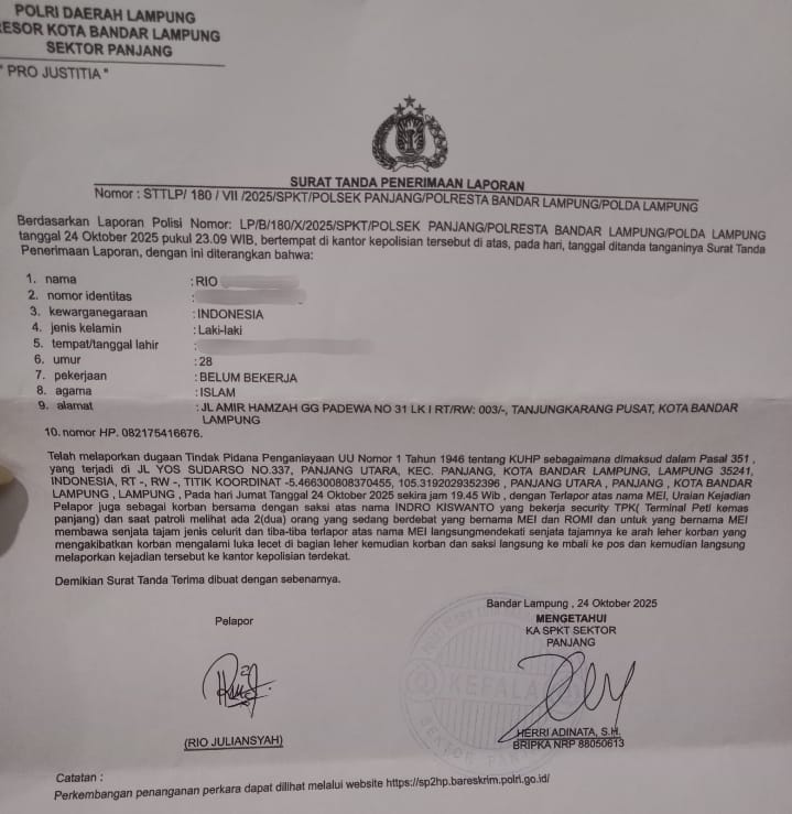 Atas insiden itu, korban melapor ke Polsek Panjang dengan LP/B.180/VII/2025/SPKT/POLSEK PANJANG/POLRESTA BANDAR LAMPUNG, tertanggal 24 Oktober 2025.