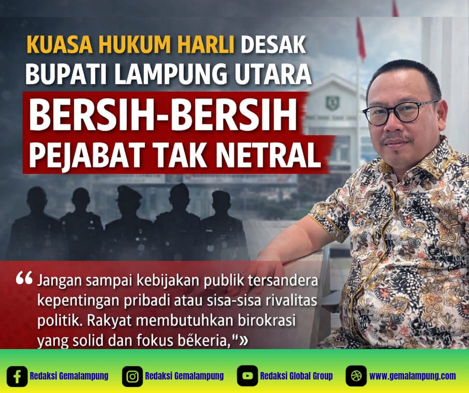 Lampung Utara – Tekanan terhadap birokrasi di Kabupaten Lampung Utara kian menguat. Mantan kuasa hukum pasangan Hamartoni–Romli (Harli) mendesak Bupati Lampung Utara untuk segera mengambil langkah tegas terhadap pejabat yang terbukti tidak netral dalam kontestasi politik.
