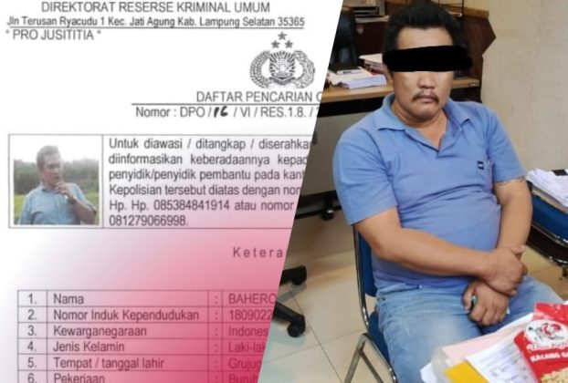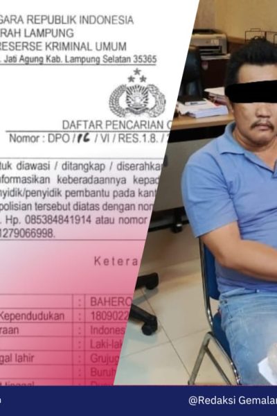 Bandar Lampung — Ditreskrimum Polda Lampung akhirnya berhasil mengamankan Bahenromsyah, buronan yang masuk dalam Daftar Pencarian Orang (DPO) kasus pencurian dan pengrusakan lahan milik Sumarno Mustopo di Desa Lumbirejo, Kecamatan Negeri Katon, Kabupaten Pesawaran. Penangkapan Bahenromsyah terjadi di lokasi persembunyiannya setelah sekian lama buron. Sejumlah foto yang beredar memperlihatkan tersangka tengah menjalani pemeriksaan oleh penyidik […]