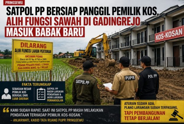 PRINGSEWU – Penanganan kasus alih fungsi lahan pertanian di Kecamatan Gadingrejo memasuki tahap lanjutan. Setelah sorotan publik terhadap maraknya pembangunan kos-kosan di atas lahan sawah produktif, aparat pemerintah daerah mulai mengambil langkah. Satuan Polisi Pamong Praja Kabupaten Pringsewu dikabarkan akan memanggil sejumlah pemilik kos yang diduga melanggar aturan tata ruang di wilayah tersebut. Langkah ini […]