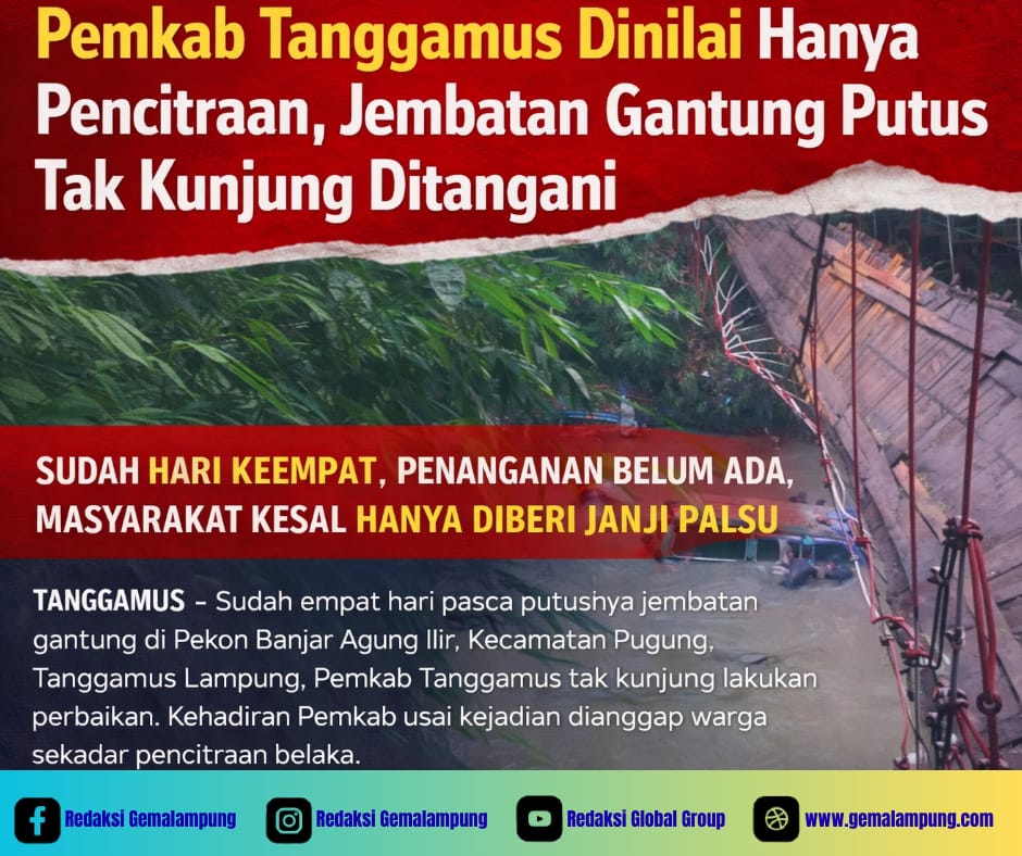 TANGGAMUS – Kekecewaan mendalam dirasakan warga Pekon Banjar Agung Ilir, Kecamatan Pugung, Kabupaten Tanggamus. Hingga memasuki hari ketiga pasca putusnya jembatan gantung, belum ada penanganan serius dari Pemerintah Kabupaten Tanggamus. Kehadiran Pemkab ke lokasi musibah justru dinilai warga sekadar pencitraan tanpa tindakan nyata.