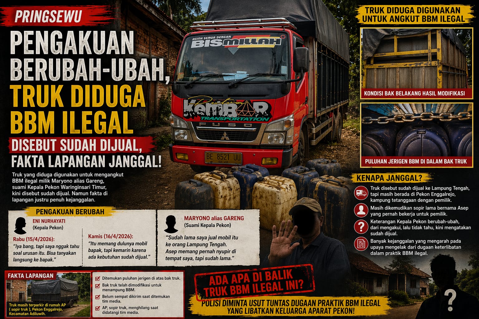 Pringsewu – Dugaan praktik pengangkutan Bahan Bakar Minyak (BBM) ilegal di Kecamatan Adiluwih, Kabupaten Pringsewu, semakin memunculkan tanda tanya besar. Setelah sebelumnya diakui sebagai milik keluarga Kepala Pekon Waringinsari Timur, kini muncul klaim baru bahwa kendaraan tersebut telah dijual.