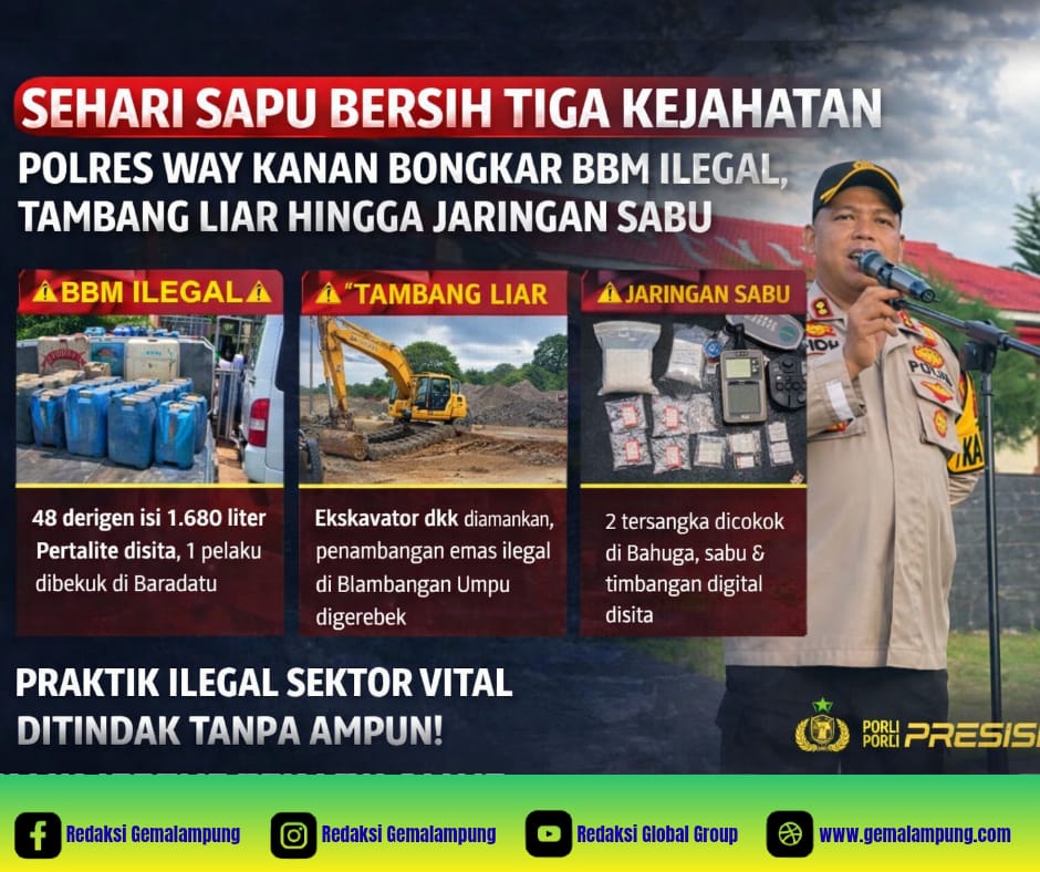 WAY KANAN – Dalam satu hari, aparat kepolisian di Kabupaten Way Kanan menunjukkan taringnya. Tiga tindak pidana strategis sekaligus, penyalahgunaan BBM subsidi, pertambangan ilegal, dan peredaran narkotika dibongkar dalam operasi yang berlangsung nyaris tanpa jeda, Minggu (12/4/2026).