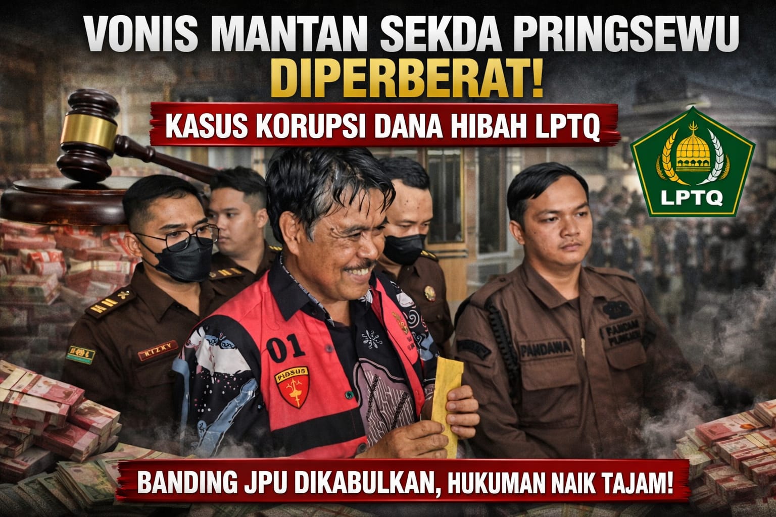 Pringsewu — Putusan ringan terhadap mantan Sekretaris Daerah Kabupaten Pringsewu, Drs. Heri Iswahyudi, M.Ag, akhirnya dikoreksi di tingkat banding. Pengadilan Tindak Pidana Korupsi pada Pengadilan Tinggi Tanjungkarang mengabulkan upaya hukum banding yang diajukan Jaksa Penuntut Umum (JPU) Kejaksaan Negeri Pringsewu dan menjatuhkan hukuman yang lebih berat dalam perkara korupsi Dana Hibah LPTQ Kabupaten Pringsewu Tahun Anggaran 2022.